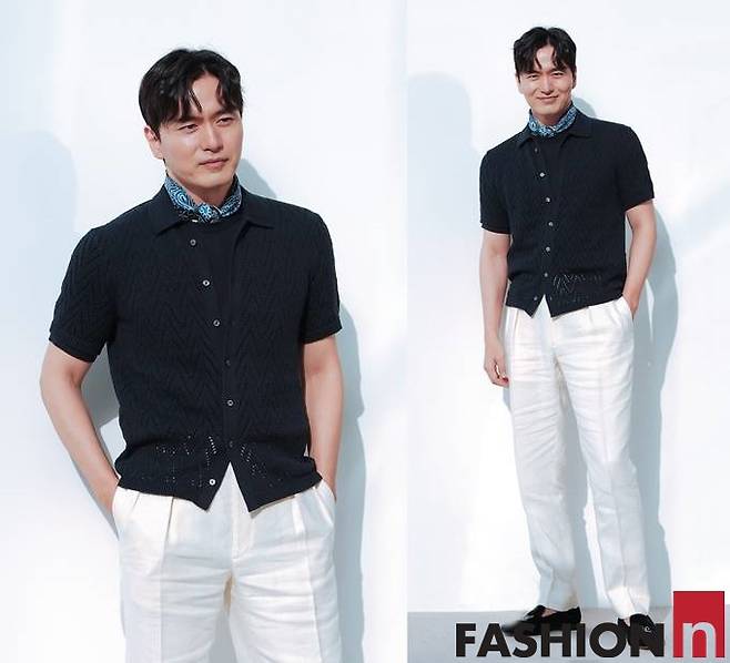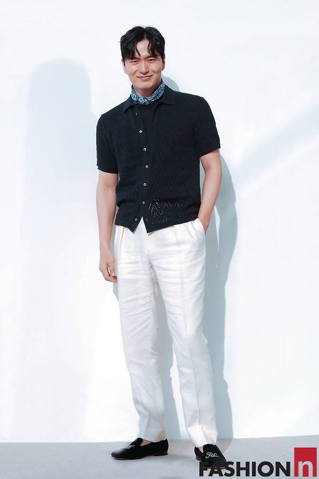 배우 이진욱이 클래식한 블랙앤화이트룩으로 부산 해운대구에 등장했다.
