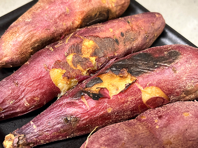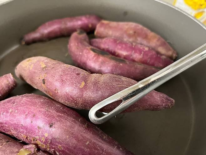 중간중간 고구마를 뒤집어 앞 뒷면이 골고루 익도록 해 주세요.