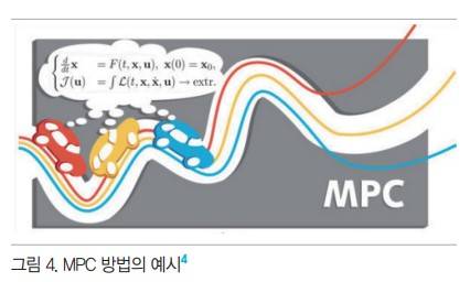 모델 예측 제어(MPC; Model Predictive Control)란, 예측 모델을 사용하여 시스템이 미래에 어떻게 동작할지 예측하고, 예측된 상태가 주어진 목적함수를 추종할 수 있도록 제어량을 최적화하는 방법이다. <그림 4>는 MPC 방법의 예시를 보여준다. MPC는 예측 모델과 현재 측정값을 기반으로 제어되기 때문에, 예측 모델이 정확한 경우 설정 값(노랑 라인)을 잘 따르지만, 예측 모델의 잦은 오류는 시스템을 잘못된 방향(빨강/파랑 라인)으로 이끌 수 있다. MPC는 매 스텝마다 최적화를 해야 하기 때문에 많은 계산량과 컴퓨팅 능력이 요구되는 제어 기법이다. 따라서 과거에는 화학 공정 제어나 건물의 온도 제어 등 반응 속도가 느린 시스템과 컴퓨팅 성능이 좋은 환경에서 사용되었다. 하지만 최근 컴퓨팅 성능, 예측 모델 개발 방법, 최적화 알고리즘의 발전 덕분에 다양한 환경과 동적인 시스템에서 MPC 적용이 가능해졌다.