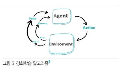 데이터 기반의 강화 학습(RL; Reinforcement Learning)은 최고의 보상을 얻는 행동을 선택하는 것이다. 환경 데이터를 수집하고 상태를 분석하여 각 상황에서 취할 수 있는 다양한 행동을 학습한다. 정의된 목표를 달성하는 행동에 대한 보상을 통해 최적의 행동을 결정한다. 교통, 기상, 자율주행, 로봇 제어, 금융, 게임, 의료 분야에서 활용되고 있다. <그림 5>는 강화 학습 알고리즘을 나타낸다. 에이전트가 관찰한 환경에서 보상을 최대화하기 위해 적절한 액션을 선택하고 학습한다. 에이전트는 시간이 지남에 따라 가장 큰 보상을 얻는 정책을 스스로 찾아야 하며, 최적의 정책은 최종적으로 최대의 보상을 가져오는 것으로 간주된다.