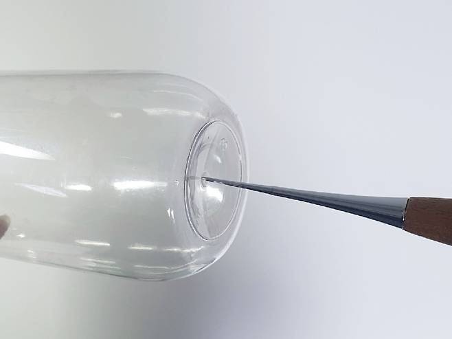먼저 송곳에 열을 가해 투명 플라스틱 병 하단 중앙에 구멍을 뚫어주세요.