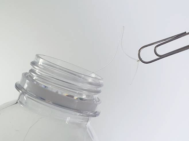 그다음 병 입구에 통과한 낚싯줄 끝을 클립 끝에 묶어주세요.