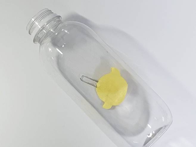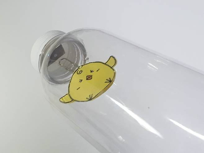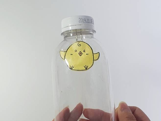 준비물 : 투명 플라스틱 병, 색종이, 자석, 투명 낚싯줄(늘어나지 않는 것), 테이프