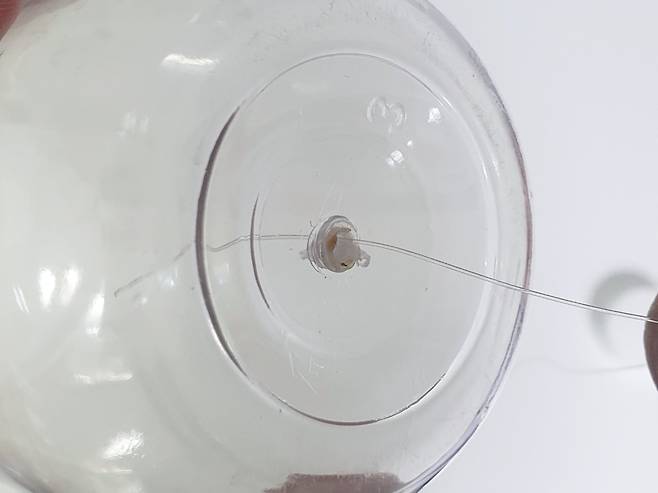 그다음 구멍 사이로 낚싯줄을 통과시켜주세요. 이때 주의해야 할 사항은 늘어나는 우레탄 낚싯줄이 아닌!!! 늘어나지 않는 낚싯줄을 사용해 주셔야 한답니다.