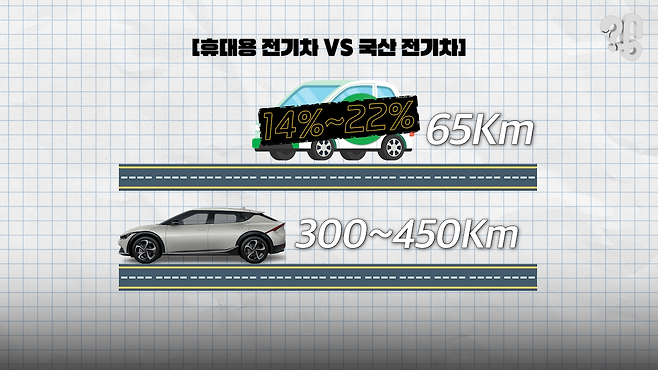 배터리 전문가에게 물어봤더니 더 자세한 설명을 들을 수 있었다. 휴대가 가능한 배터리의 무게나 부피로는 전기차에 쓸만한 수준의 전력을 담기가 어렵다는 것.