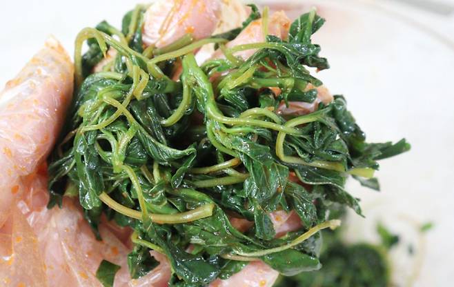 양념: 고추장 1큰술, 된장 0.5큰술, 다진 마늘 1작은술, 매실청 1큰술, 참기름 1큰술, 깨소금 1큰술