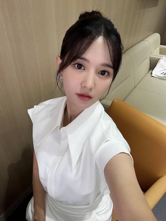 헤어는 정수리 부분에 살짝 볼륨을 준 뒤 전체를 묶어 올린 번 스타일로 연출됐으며, 앞머리는 가볍게 나누어 양옆으로 떨어뜨려 부드럽고 여성스러운 분위기를 살렸습니다.