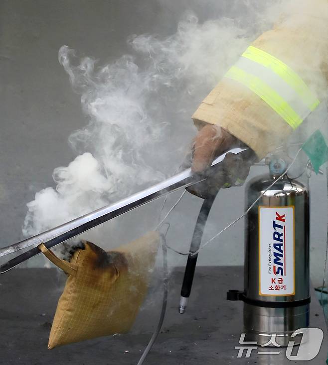 이번 실험은 발열, 물리적 충격, 과충전 등의 조건에서 리튬이온 배터리가 어떻게 반응하는지를 관찰하는 방법으로 진행됐으며, 배터리의 안전한 보관법을 마련하기 위해 아라미드 소재인 소방관 폐방화복으로 부산소방재난본부가 제작한 안전보관 파우치(방화팩)의 성능검증도 병행됐다. 2025.3.12/뉴스1