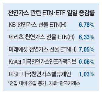 '메리츠 천연가스 선물 ETN(H)'과 '대신 천연가스 선물 ETN(H)'도 각각 전날보다 6.33%, 5.97% 올랐다.