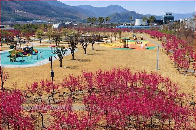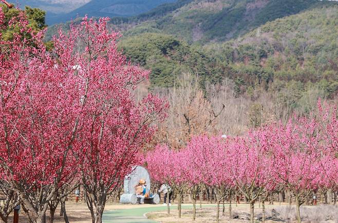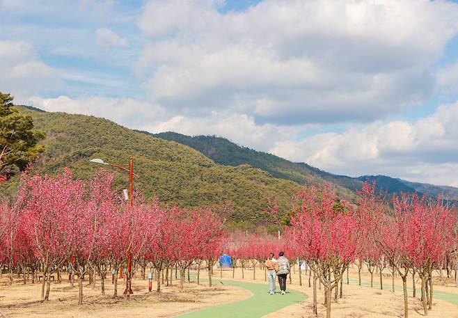 이 공원이 특히 유명해진 이유는 바로 홍매화 산책로 때문입니다. 공원 곳곳에는 약 1,500그루의 홍매화 나무가 심어져 있어 봄이 되면 붉은 꽃이 산책로를 따라 피어납니다. 올해 홍매화는 3월 첫 주에 만개할 것으로 예상합니다. 그래서 이 시기에는 섬진강 풍경과 어우러져 매우 아름다운 장면을 만들어냅니다.