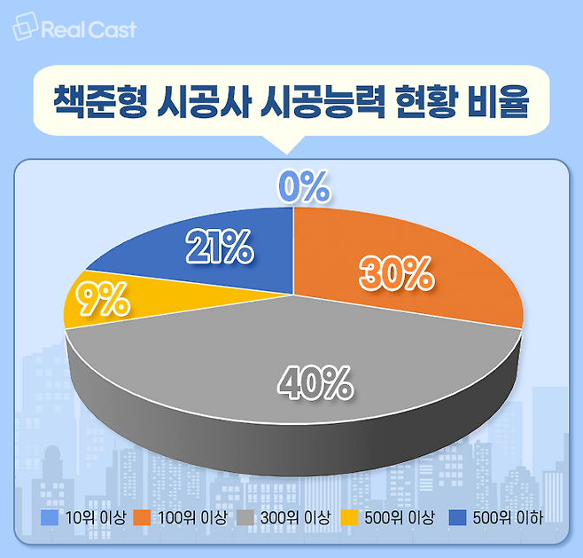 그 원인으로는 책준형 사업에 참여하는 시공사의 시공 능력이 차입형과 비교해 상대적으로 열위에 놓여있다는 부분을 지적했습니다. 2022년 총 사업비 기준으로 책준형은 시공 능력 10위 이상인 곳이 0%로 나타났습니다. 시공 능력 100위 이하인 시공사 비중은 책준형이 무려 70%로 차입형(16%)보다 4배 이상 많습니다. 시공능력 500위 이하 시공사 비중도 책준형은 21%나 달했습니다(차입형은 2%).