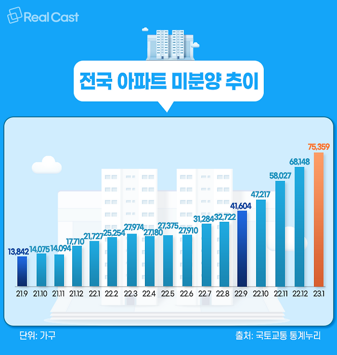 한때 불패를 자랑했던 분양시장에서도 미분양이 속출하고 있습니다. 국토교통 통계누리의 전국 미분양주택 현황은 2021년 1월 1만7130가구를 기록한 이래 그해 9월 1만3842가구로 급감하며 빠른 감소세를 나타낸 바 있는데요. 2022년에는 9월 4만1604가구로 1년 만에 무려 3만 가구 가까이 증가한 후, 2023년 1월에는 7만5359가구로 4개월 만에 3만 가구가 넘게 늘었습니다.