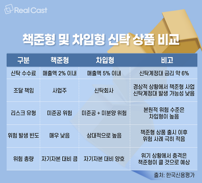 이에 한신평 보고서에 따르면, 토지신탁 진행 사업장 중 책준형이 차입형보다 2배 이상의 규모에 달한다고 알려졌습니다. 2022년 9월 기준으로 책준형은 62조원, 차입형은 26조원으로 책준형 상품의 규모가 차입형의 약 2.4배에 달했는데요. 보고서에 따르면 본래 사업 위험도는 차입형이 책준형보다 더 크지만, 지금과 같은 침체 상황에서는 책준형의 위험 총량이 더 커질 수 있다고 경고했습니다.