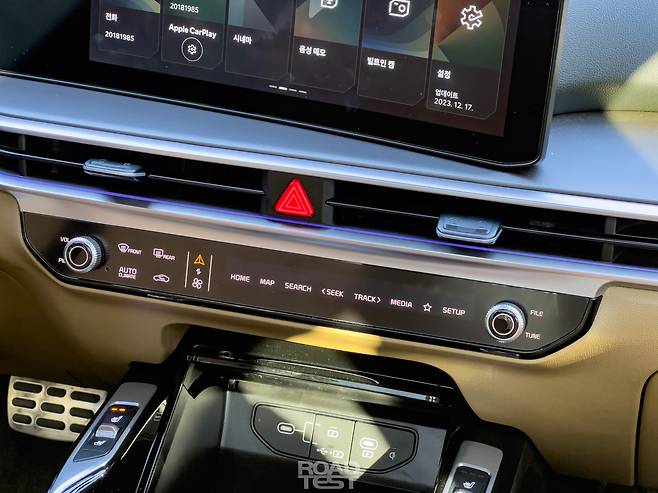 송풍구와 공조장치 조작 패널도 눈에 띈다. 기존의 상/하단 분리형 대신 가로형 송풍구로 바꿨다. 빈자리에는 K8과 EV6에서 볼 수 있었던 인포테인먼트/공조 전환 통합 컨트롤을 마련했다. 1열 가운데 운전석은 에르고 모션 시트(무중력 자세 및 체압 분포 최적화), 동반석은 여기에 레그레스트 각도 조절기능까지 더한 릴렉션 컴포트 시트를 적용했다.