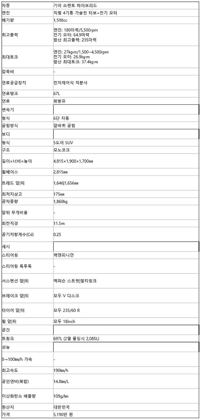 쏘렌토 하이브리드의 가격은 3,929만 원부터 시작한다. 시그니처 트림에 각종 옵션을 모두 선택한 시승차의 가격은 5,182만 원으로, 비슷한 옵션의 현대 싼타페와 거의 같다. 카니발보다는 약 550만 원 저렴해 4인 가정에게는 합리적인 선택으로 보인다. 그러나 5인 이상일 경우 카니발을 추천한다.
