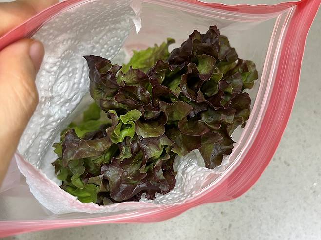 키친타월로 감싼 상태에서 지퍼백에 넣으면 습기 조절 효과도 있어 냉장고 속에서도 더 오래 아삭한 식감을 유지할 수 있습니다.
