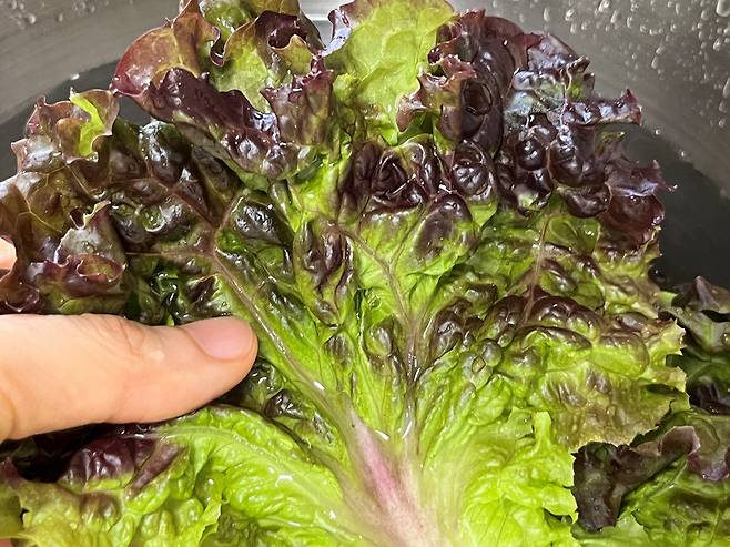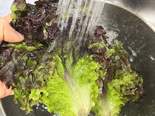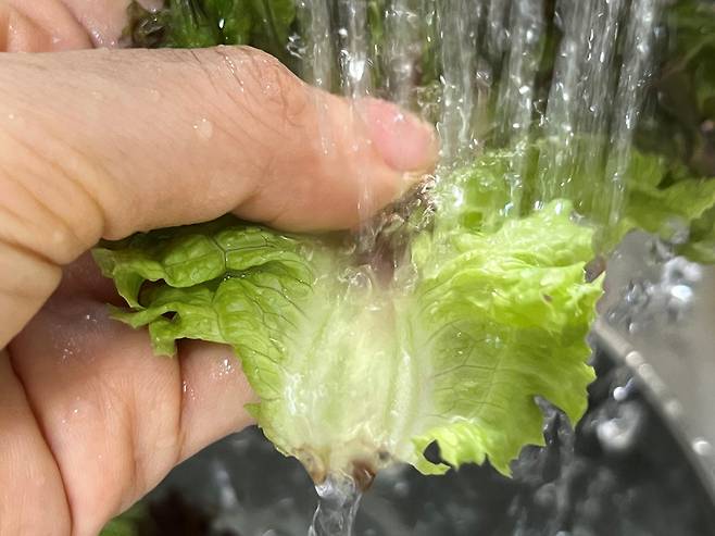 상추는 아래 줄기 부분에 의외로 불순물이 많이 묻어있습니다. 한 장씩 손으로 이 부분을 문질러 씻어 주세요.