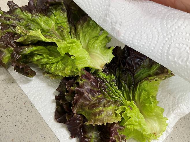 상추의 물기가 어느 정도 마르면 키친타월로 감싸 주세요. 잎 사이에 남은 잔여 수분을 흡수해 주기 때문에 상추가 더 오래 신선하게 유지됩니다.