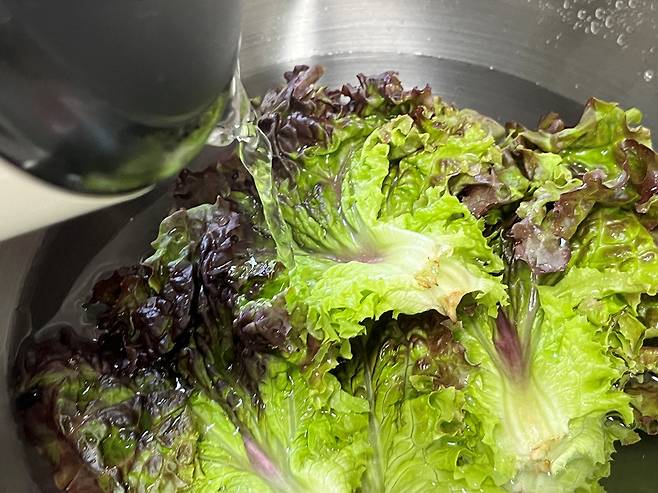 약간 시들시들해진 상추는 따뜻한 물(40도~50도)에 1~2분간 담그세요. 이때 물 온도가 너무 높으면 상추가 익어버리니, 찬물과 섞어서 온도를 잘 맞춰 주세요.