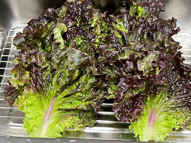 세척한 상추는 물기를 말리기 위해 밧드 위에 올려서 건조시킵니다. 수분이 남으면 금방 물러지거나 쉽게 상할 수 있기 때문에, 수분 제거가 중요합니다.