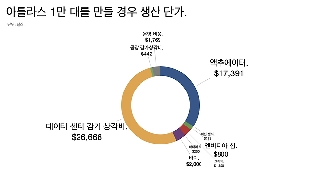- 1만 대 기준으로 로봇의 핵심 부품인 액추에이터는 561달러까지 낮아진다. 모두 31개가 들어간다. 가장 많은 비용을 차지하는 건 데이터 센터 감가상각비다. 로봇 한 대에 2만6666달러를 잡아야 한다.