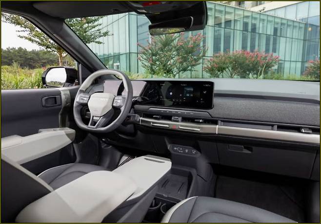 EV3의 실내는 세련된 디자인과 실용적인 공간 활용이 돋보입니다. 미디엄 그레이, 네이비, 라이트 그레이 등 다양한 내장 색상 옵션을 제공하며, 일부 트림에서는 차콜&화이트 조합도 선택할 수 있습니다.