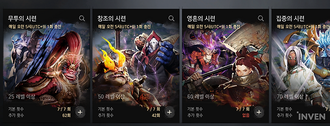시련 던전 신규 난이도 추가! 블레이드 앤 소울2의 시련 던전 신규 난이도가 추가됐다. 무투, 창조, 영혼, 집중, 시련의 신규 난이도로 헌신, 천신, 영겁, 태초의 4개 난이도가 각가 추가됐다. 해당 던전은 던전 - 시련 탭에서 입장할 수 있다. 각 던전의 주요 보상은 신선루(각인), 소울 파편, 언령석 상자 등 기존 던전의 보상이 강화된 형태다. 신규 던전이 추가됨에 따라 장비 도감, 시련 업적도 늘어났다.