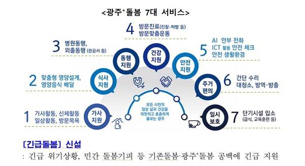 시는 신청자들에게 가사, 식사, 동행, 건강 지원, 안전 지원, 주거 편의, 일시보호 등 7가지 서비스 중 적절한 것을 맞춤형으로 제공할 계획이다. 김경명 광주시 복지혁신팀 주무관은 “방문 요양서비스의 1인당 한도는 연 150만원이다. 하루 6시간 돌봄이 필요한 노인의 경우 정부의 재가노인 방문요양 하루 3시간 외에 광주 플러스 돌봄 서비스를 신청하면 하루 3시간 요양서비스를 추가로 받을 수 있다”고 설명했다.