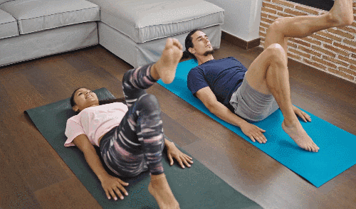 매트에 누워 양손은 바닥에 고정합니다. 다리를 공중으로 들어 무릎을 구부린 상태를 만듭니다. 복부에 힘을 주고 왼쪽 다리를 내리면서 발끝으로 바닥을 가볍게 터치합니다. 다시 원위치로 돌아오고, 오른쪽 다리도 같은 방식으로 반복합니다.