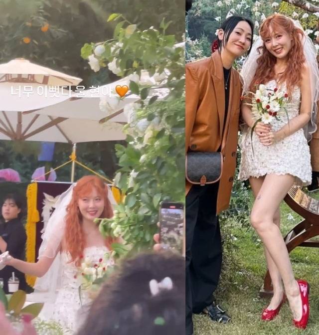 공개된 사진에는 현아와 함께한 예은의 모습이 담겼다. 예은은 갈색 가죽재킷에 통 넓은 검은 바지, 로퍼를 착용했다. 평소 남다른 패션센스를 자랑하는 예은의 힙한 하객룩이 절로 시선을 사로잡는다. 새하얀 초미니 웨딩드레스에 빨간 플랫, 조그마한 부캐를 들고 있는 '새 신부' 현아 역시 눈길을 끈다.