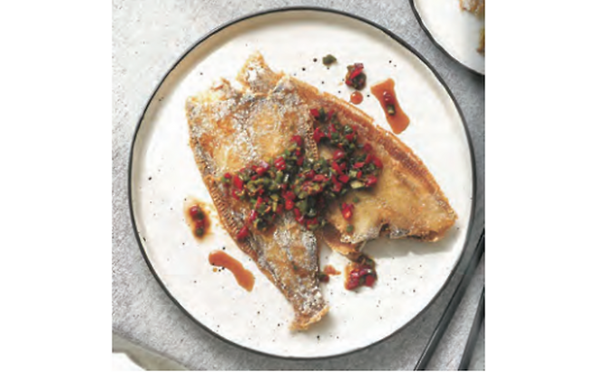④ 그릇에 가자미를 담고 탕수 소스를 곁들입니다.