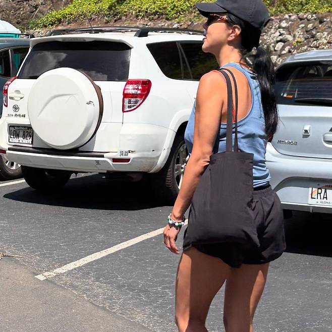 마지막 컷에서는 블루 톤 스포츠 탑에 블랙 쇼츠로 활동적인 스포츠 룩을 연출하고 있다. 블랙 캡과 토트백으로 실용성을 강조하면서도 건강한 라이프스타일을 표현하는 스타일링을 보여주고 있다.