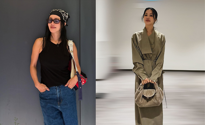 첫 번째 사진에서 엄정화는 편안한 카페 데이트 룩을 연출하고 있다. 검은색 탱크톱에 회색 와이드 팬츠를 매칭하여 단정하면서도 여유로운 분위기를 자아낸다. '리즌널' 로고가 새겨진 블랙 캡과 선글라스로 캐주얼함을 더하면서도 세련된 감각을 드러내고 있다. 특히 목걸이와 팔찌 등 섬세한 액세서리로 포인트를 주어 완성도 높은 일상 스타일링을 보여준다.