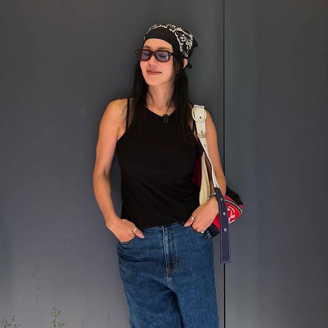 블랙 슬리브리스 톱에 데님 바지로 시크한 스트리트 패션을 선보인다. 체인 패턴의 헤어밴드와 선글라스로 강렬한 포인트를 주었으며, 어깨에 메고 있는 화이트와 레드 컬러의 백팩이 스포티한 매력을 더하고 있다.