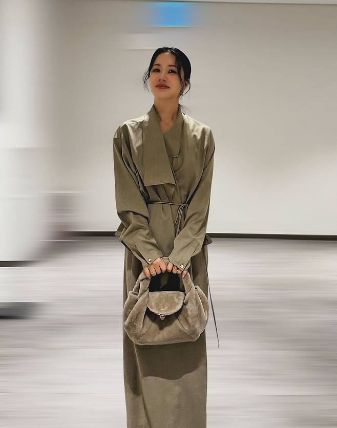 카키색 롱 코트로 완전히 다른 매력을 발산하고 있다. 벨트로 허리 라인을 강조한 오버사이즈 코트는 모던하면서도 단아한 느낌을 연출한다. 베이지톤 퍼 소재 핸드백을 매칭하여 따뜻한 계절감을 표현하면서도 세련된 컬러 조합을 완성하고 있다.
