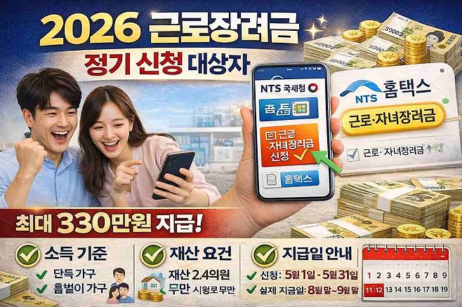 2026년 근로장려금 정기 신청이 5월부터 시작된다. 올해는 물가 상승분을 반영해 재산 요건이 일부 조정되면서 대상 범위가 확대됐다. 최대 330만 원까지 받을 수 있는 이번 제도는 신청주의 방식으로 운영되기 때문에, 대상자라면 반드시 직접 신청해야 한다.