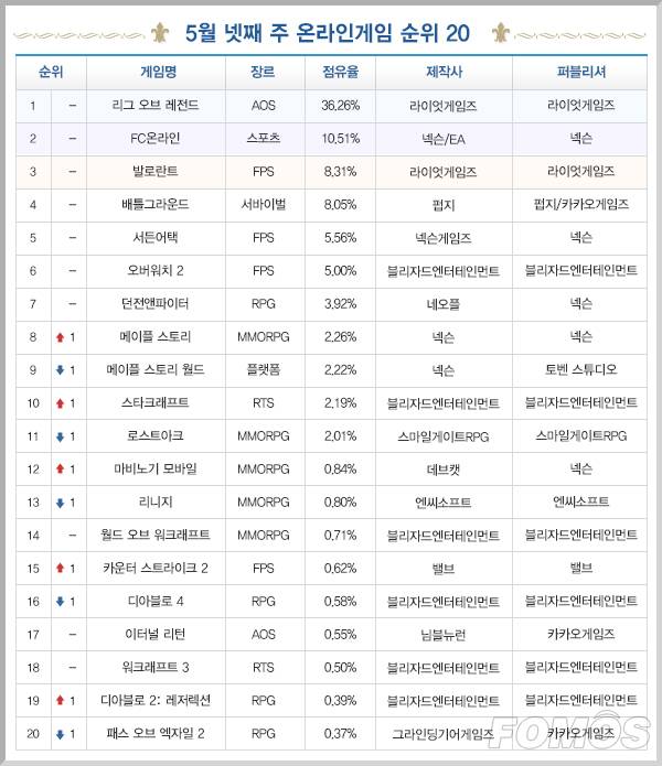 5월 넷째 주 온라인 게임 이용시간 순위에선 업데이트와 시즌 효과가 줄어든 RPG들이 약세를 보였다.