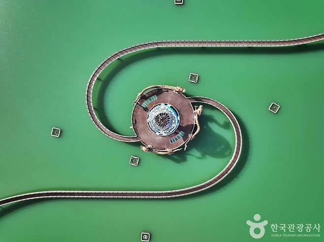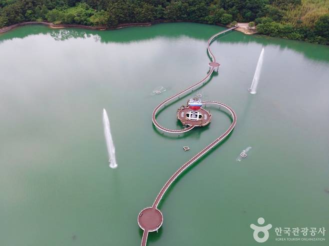 전북 정읍의 ‘미르샘 다리’는 용산호를 가로지르는 642m 길이의 데크 다리예요.