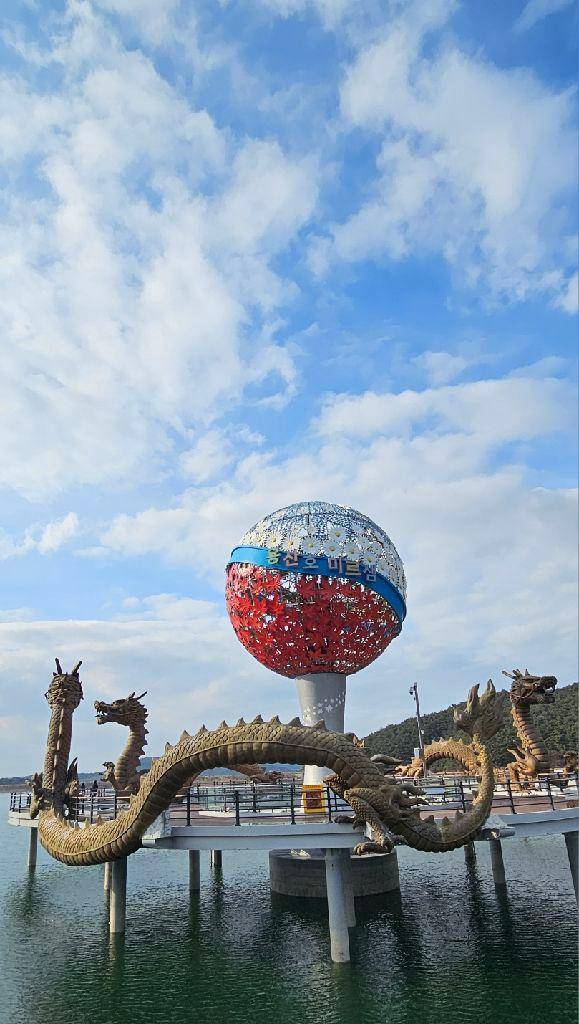 다리 중간에는 잠시 쉬어갈 수 있는 벤치가 마련돼 있어요. 천천히 걸으며 호수 바람을 느끼다가, 마음에 드는 지점에 앉아 풍경을 감상하기 딱 좋죠. 다리 중심에는 정읍을 상징하는 3가지 조형물인 단풍, 구절초, 라벤더가 어우러진 ‘구’, 정읍의 '샘', 용산호의 ‘용’이 조화를 이루고 있어 자연과 이야기가 함께하는 공간이기도 해요.