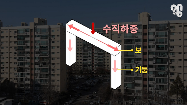 보는 기둥이 받쳐주지 않는 부분의 무게를 기둥 쪽으로 분산시키려고 만든 건데, 이게 결과적으로 윗층에서 전해지는 진동을 잡아주는 효과가 있고, 진동이 줄어드니까 소음도 줄어든다.