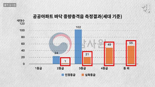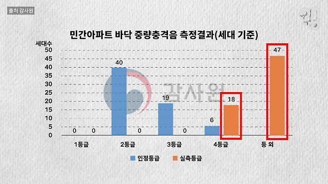 그런데 놀라운 사실은 이런 사전 인정받은 것들이 죄다 엉망진창이었다는 점이다. 감사원이 2019년에 작정하고 실제 어떤지 검사를 해보니까 공공아파트의 경우 발망치로 쿵쿵거리는 걸 뜻하는 중량충격음의 등급이 사전 인정받은 등급보다 더 낮은 곳이 86%였고, 절반은 아예 최소성능기준에도 미치지 못했다.