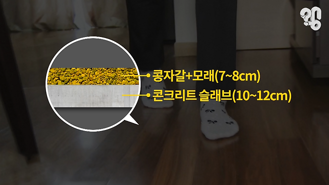 ‘아파트 공화국’인 한국에서 아파트는 급속한 경제성장과 함께 빠르게 확산됐는데 특히 주목할 것은 아파트 바닥구조다. 맨 아래 10~12㎝ 두께의 콘크리트 슬래브를 깔고 그 위에 온돌 난방을 위해서 하천에서 캐온 콩자갈을 깐 뒤 그 위에 모래를 부어 사이를 메웠다. 지금도 서울 종로에 가보면 확인할 수 있는 유사시 전차도 들어갈 수 있는 아파트 를 보면 벽에 못이 안들어간다고 할 정도로 튼튼한 아파트들인데 층간 바닥구조 역시 무거운 재료를 빽빽하게 채워서 진동을 최소한 형태였다.