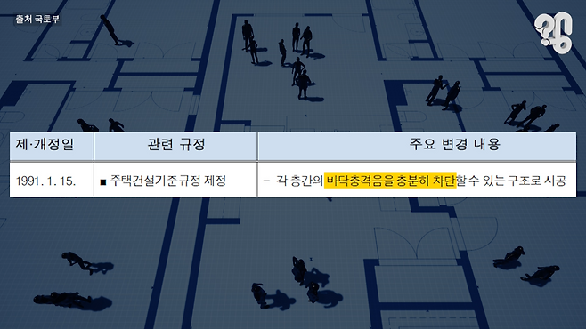 층간소음 문제가 해결되지 않는 이유는 보여주기식 관리규정만 만들어놓고 관리하지 않은 역대 정부들과 이를 악용해 허술한 아파트를 분양한 건설사의 환장의 콜라보가 큰 역할을 했다. 신도시 건설붐으로 아파트 시공방식에 큰 변화가 왔지만 동시에 층간소음 헬게이트가 열리자 정부도 대책을 내놓기는 했었다. 믿기 어렵지만 실제로 이랬다고 하는데 공동주택의 바닥구조 관리 규정이 애초에 90년대 처음 만들어졌을 때는 ‘바닥충격음을 충분히 차단하라’면서 그냥 선언 수준으로 돼 있던 걸 2000년대 중반쯤부터 ‘콘크리트 슬래브 두께를 라멘 구조는 150㎜, 소음에 취약한 벽식의 경우 두께를 210㎜ 이상으로 하라’는 식으로 구체적인 지침을 준다.