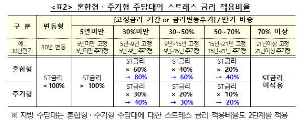 변동형 및 3년미만 단기 고정그림 상품은 스트레스 금리를 100% 그대로 적용하고, 만기 3~5년 순수고정 신용대출은 60%, 만기 5년이상은 스트레스 금리를 미적용한다.
