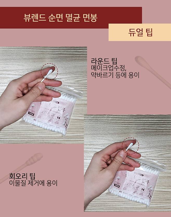 라운드 팁은 연고 바를 때나 메이크업 수정할 때 사용하기에 좋고 회오리 팁은 이물질 제거에 용이해서 귀 청소를 하거나 좁은 틈새 청소에도 좋을 것 같아.