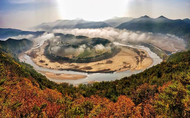 경북 예천에 있는 마을 회룡포는 용이 휘감아 돌아간다는 뜻이야. 이름처럼 거대한 용이 마을을 감싸 안고 있는 듯한 모습이지 않랭? 이곳은 바다 위 섬이 아닌 육지 속의 섬 마을로 낙동강 지류인 내성천이 마을을 휘감고 있어. 그 모습이 꼭 용을 닮아 신비한 느낌을 자아내. 마을의 전체 풍경은 회룡포 전망대에 오르면 볼 수 있어. 오르막길이 조금 힘들 수 있지만 약 15분만 걸으면 전망대에 도착한다고 해. 태백산 산자락과 어우러진 멋진 마을의 절경을 보고 있으면 힘든 것도 금세 잊고 마음이 벅차오를 거야.