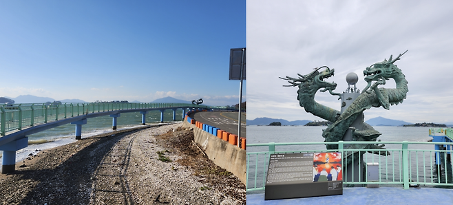 삼천포대교공원에 간다면 바다 위에 펼쳐진 해안 데크길인 노을전망교를 꼭 걸어봐. 끝없는 바다를 바라보며 길을 따라 걷다 보면 마침내 거대한 용 두 마리가 여의주를 찾아 승천하는 모습을 담은 조형물을 만날 수 있어. 바다 한가운데에서 승천하는 용의 모습이 더욱 웅장하고 아름다워. 이곳은 일몰이 아름답기로도 유명하니 해가 지는 시간에 맞추어 방문하는 것을 추천해. 용의 모습 뒤로 붉게 물드는 하늘이 장관일 거야.