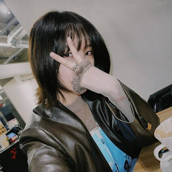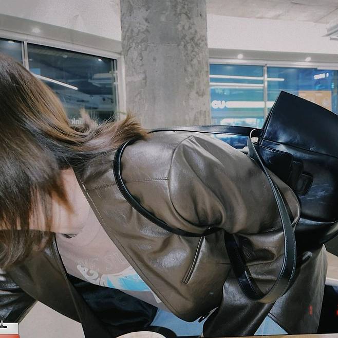 윤은혜는 노카라 가죽 재킷을 입고 시크한 스타일을 연출했습니다.