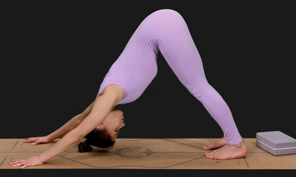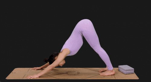 매트에 엎드린 후 엉덩이를 공중으로 높이 들어 다운도그 자세를 취합니다. 오른손을 왼발 쪽으로 뻗으면서 몸을 틀어줍니다. 다운도그 자세로 돌아갑니다. 이번에는 왼손을 오른발 쪽으로 뻗으면서 몸을 틀어줍니다.