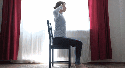 의자에 앉아 척추를 곧게 펴고 바른 자세를 잡습니다. 손을 머리 옆에 두고 팔꿈치를 바깥쪽으로 펼칩니다. 상체를 천천히 오른쪽으로 숙이면서 옆구리 근육이 스트레칭되는 것을 느낍니다. 원래 위치로 돌아오면, 상체를 왼쪽으로 숙이면서 운동하세요.